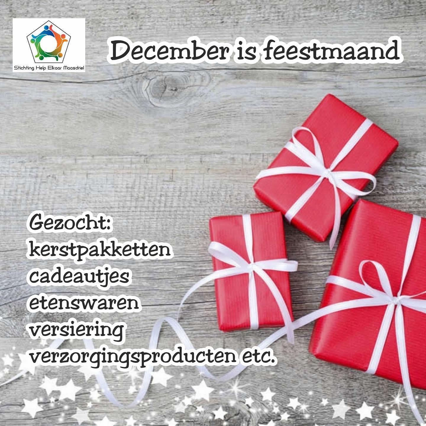 Voor de december maand zijn wij hard op zoek naar particulieren en bedrijven die willen helpen om de minima van de gemeente Maasdriel fijne feestdagen te bezorgen. We zamelen o.a. verzorgingsproducten, kerstversiering, kerstpakketten e.d. in. Helpt U ons helpen? Neem gerust contact op via het contactformulier of mail naar info@helpelkaarmaasdriel.nl !