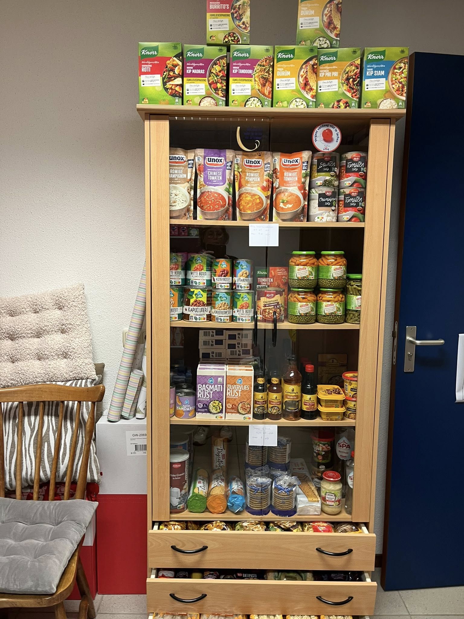 De prachtige gekregen kast geinstalleerd en meteen gevuld.
